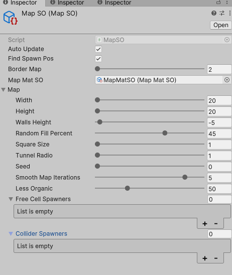 I create a “Scriptable object” type “MapSO” and assign the “Scriptable object” “MapMatSO” created in the first step in the corresponding section.